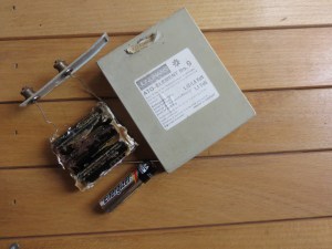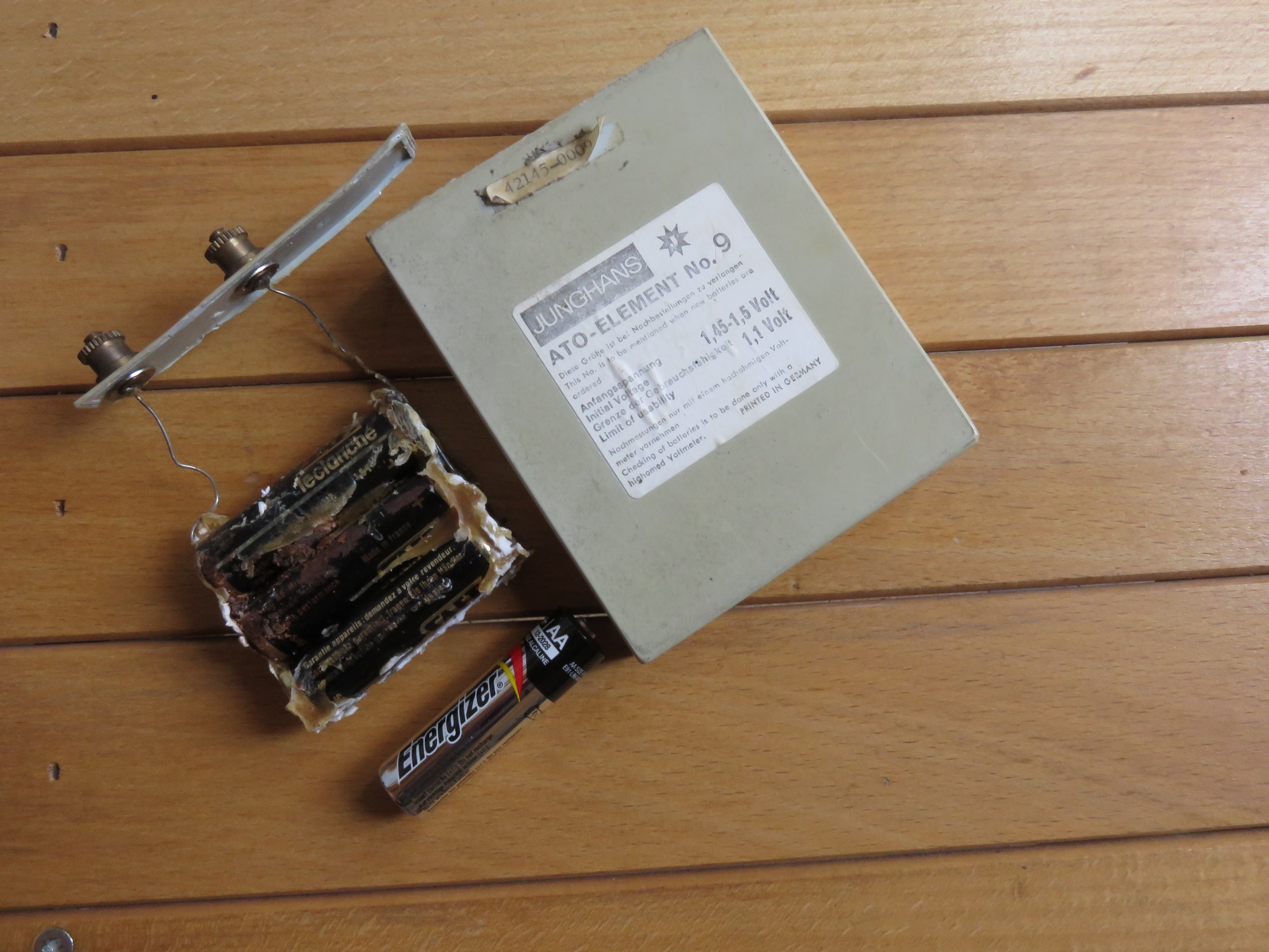 Une pile d’origine pour ces mécanismes: 3 piles AA en parallèle enrobées dans du carton, du polystyrène et un genre de cire.